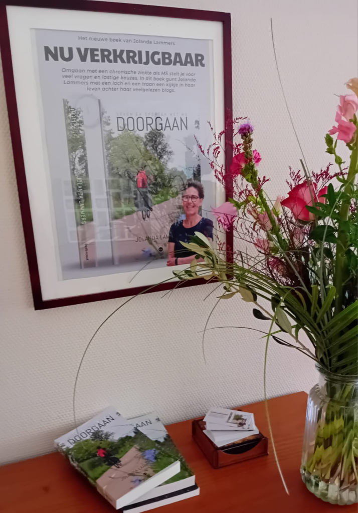 Op vijftien september was het eindelijk zover. Mijn boek Doorgaan, leven en sporten met MS kwam uit. In de pre-order kon het boek al een weekje eerder besteld worden. Het is een spannende tijd. Het blijft bijzonder om je eigen boek in handen te hebben. Je eigen verhaal, je eigen woorden! Er was een kaart, er waren felicitaties en ik kreeg bloemen. De eerste bestellingen werden gedaan. Allemaal spannend natuurlijk. Dan was er nog de mooie poster en waren er de visitekaartjes. Bescheiden zijn is misschien soms een mooie eigenschap, maar dit keer moet ik iets meer uit mijn comfortzone. Dus hup, zorg ervoor dat de posters hangen en deel hier en daar wat visitekaartjes uit. Zichtbaar zijn. Aandacht voor het boek. Dat was er, dat was gelukt. In de kranten een artikel en het was te vinden op allerlei websites. Ik heb er behoorlijk wat reacties op gehad. Er zijn veel mensen geweest die me hadden gezien in de krant of via Facebook of Twitter.